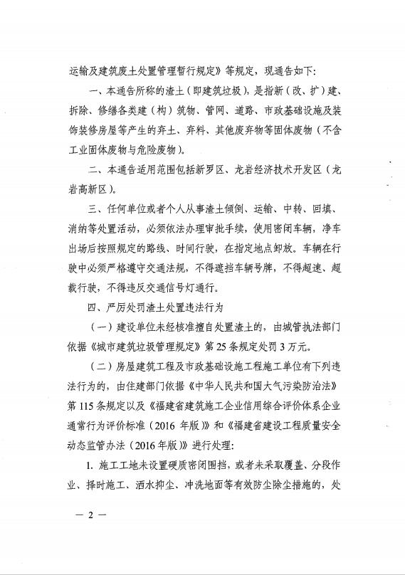 龍巖市人民政府關于嚴厲打擊渣土處置違法行為的通告(通告【2017】3號)