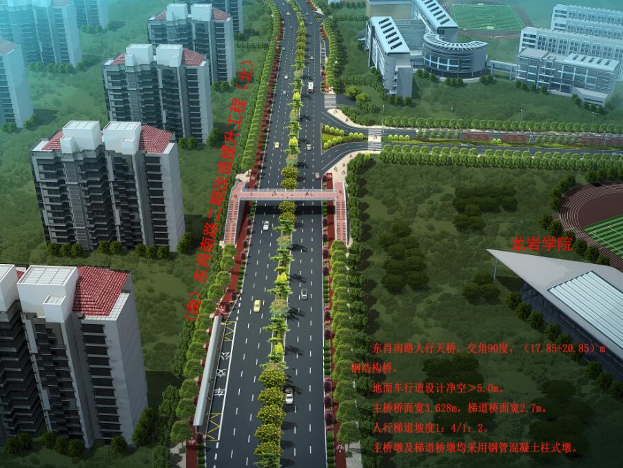 龍巖學院人行天橋位于龍巖學院大門北側約50米處,天橋采用“工”字形設計,橋面長40米、寬3.6米,兩側梯道坡度為1:4和1:2,跨度分別為17.85米和20.85米,寬2.7米,主橋墩及梯道橋墩均采用鋼管混凝土柱式墩,總投資約450萬元。