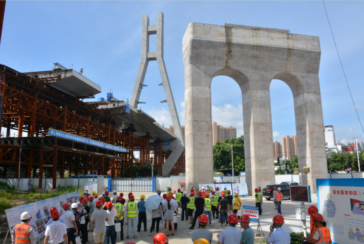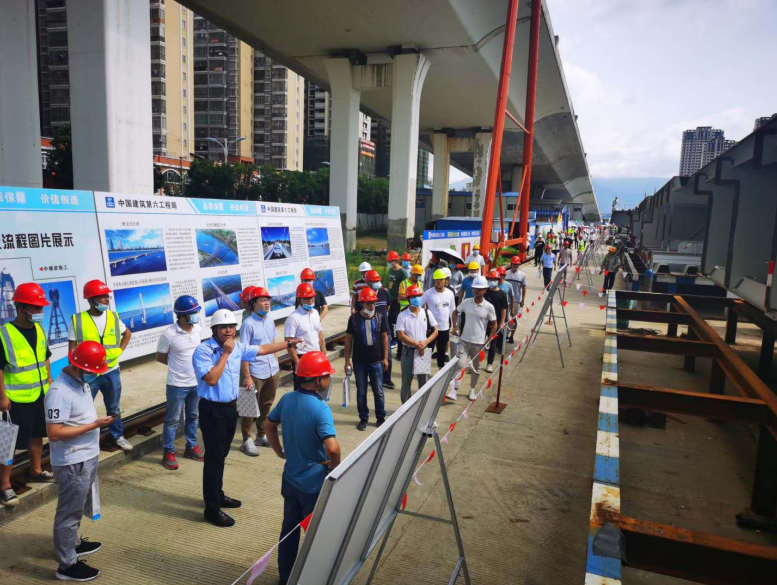2020年6月28日,由龍巖城市發(fā)展集團有限公司主辦,龍巖市政建設集團有限公司(市城投公司)承辦,北京鐵研建設監(jiān)理有限公司、中國建筑第六工程局有限公司、中冶(上海)鋼結構科技有限公司協(xié)辦的龍巖大道高架橋項目質量安全標準化觀摩會在龍巖大道高架橋主橋鋼箱梁工程現(xiàn)場舉行。觀摩會分拼裝區(qū)域、提升站區(qū)域、頂推滑移區(qū)域、步履滑移區(qū)域及主橋轉體區(qū)域分別展示了龍巖大橋主橋鋼結構拼裝、提升、弧形頂推滑移、步履滑移等新工藝及主塔“水平二次轉體”鋼箱梁頂推、斜拉索施工技術