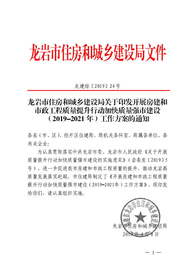龍巖市住房和城鄉建設局關于印發開展房建和市政工程質量提升行動加快質量強市建設(2019-2021年)工作方案的通知